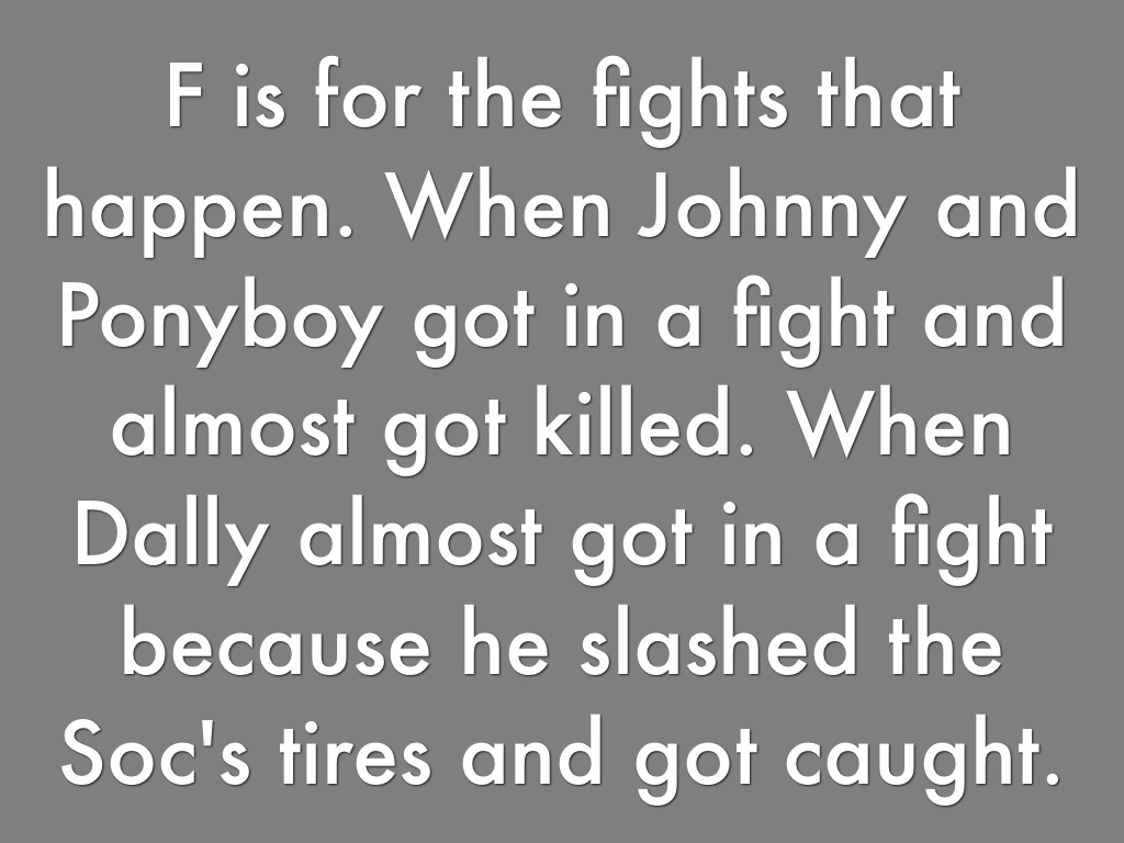 F is for the fights that happen. When Johnny and Ponyboy got in a fight and almost got killed. When Dally almost got in a fight because he slashed the Soc's tires and got caught.