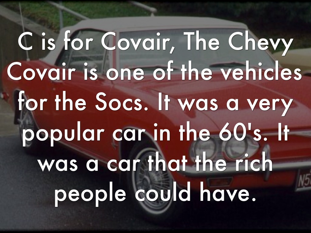 C is for Covair, The Chevy Covair is one of the vehicles for the Socs. It was a very popular car in the 60's. It was a car that the rich people could have.