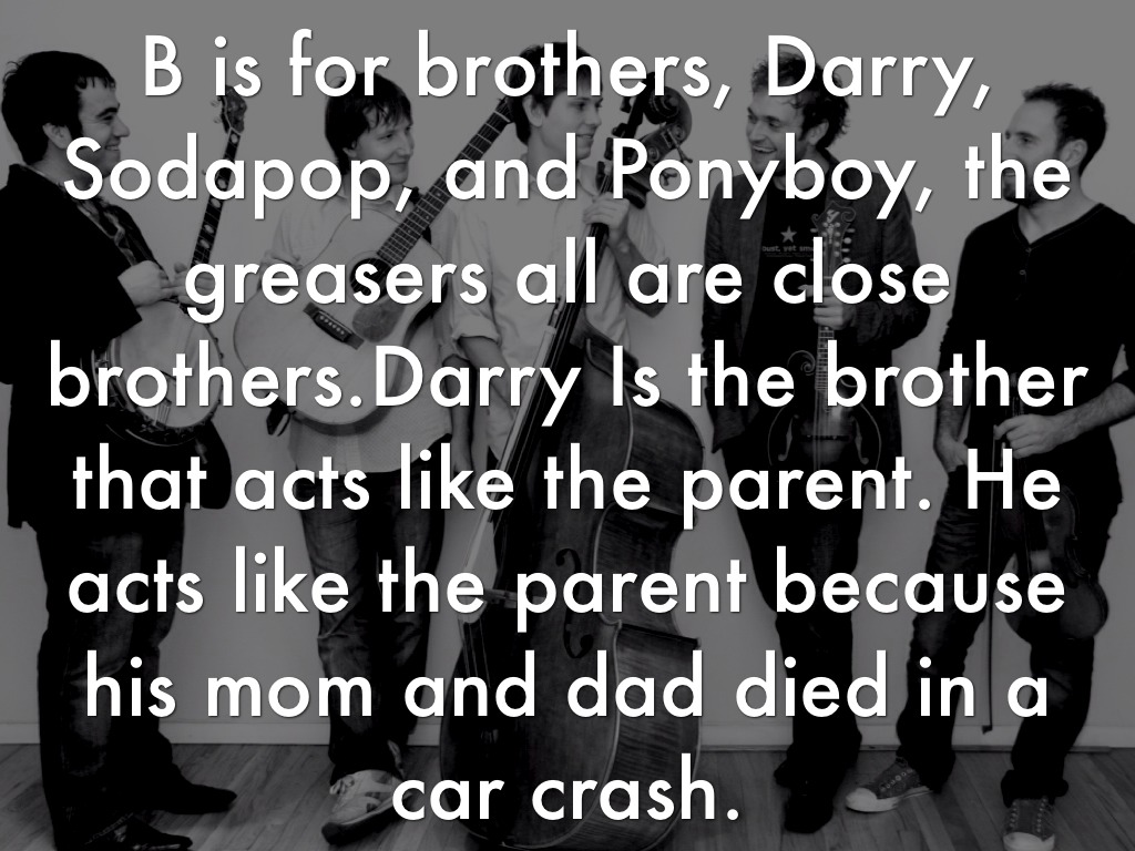 B is for brothers, Darry, Sodapop, and Ponyboy, the greasers all are close brothers.Darry Is the brother that acts like the parent. He acts like the parent because his mom and dad died in a car crash.
