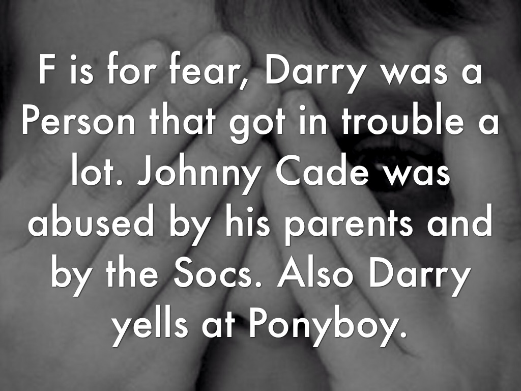 F is for fear, Darry was a Person that got in trouble a lot. Johnny Cade was abused by his parents and by the Socs. Also Darry yells at Ponyboy.