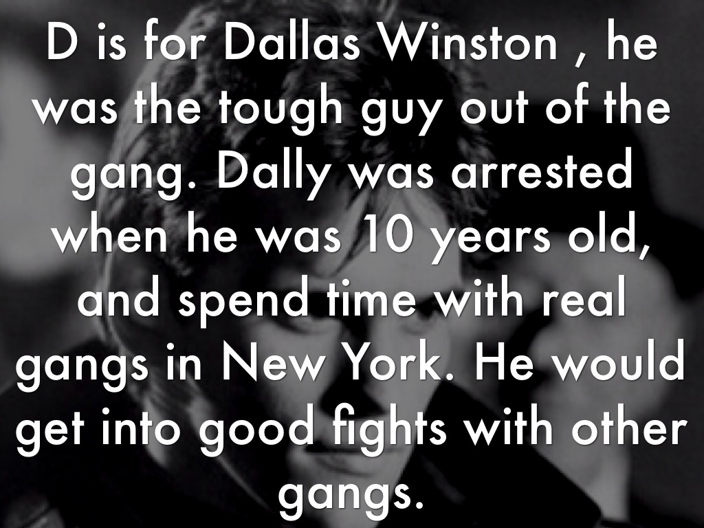 D is for Dallas Winston , he was the tough guy out of the gang. Dally was arrested when he was 10 years old, and spend time with real gangs in New York. He would get into good fights with other gangs.