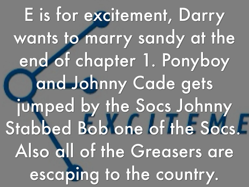 E is for excitement, Darry wants to marry sandy at the end of chapter 1. Ponyboy and Johnny Cade gets jumped by the Socs Johnny Stabbed Bob one of the Socs. Also all of the Greasers are escaping to the country.