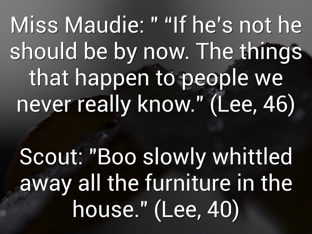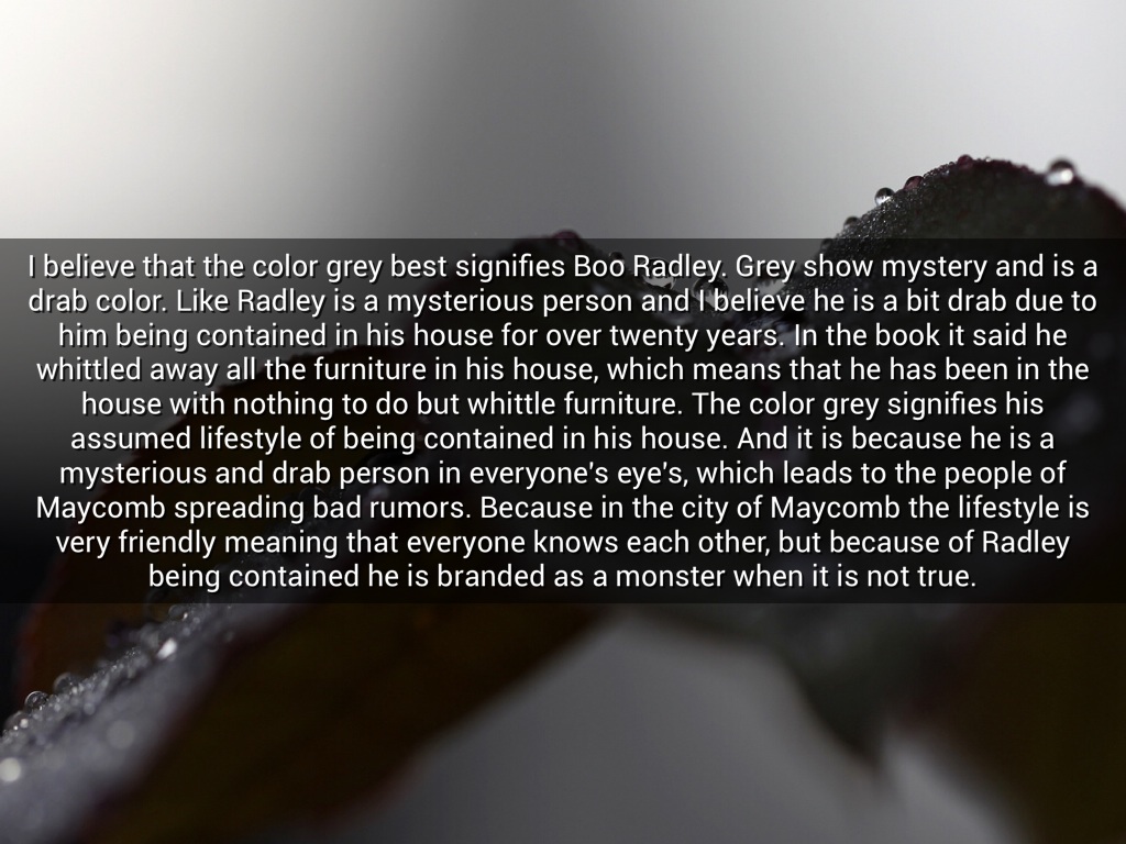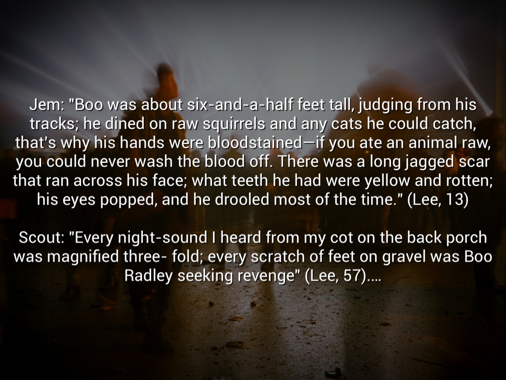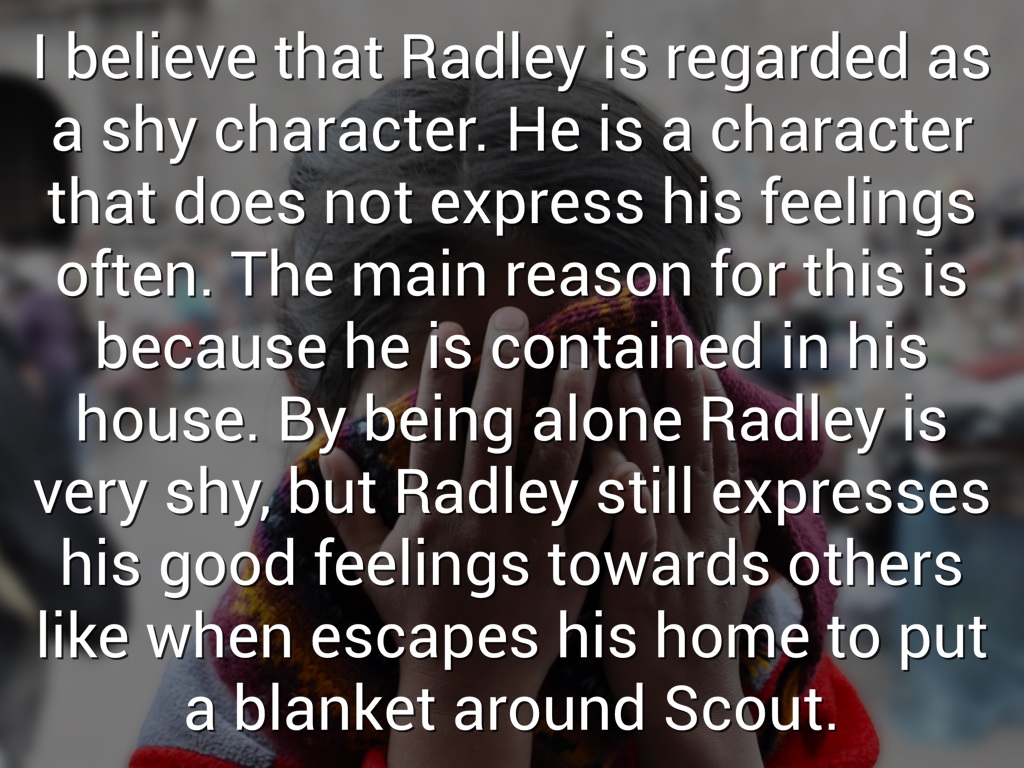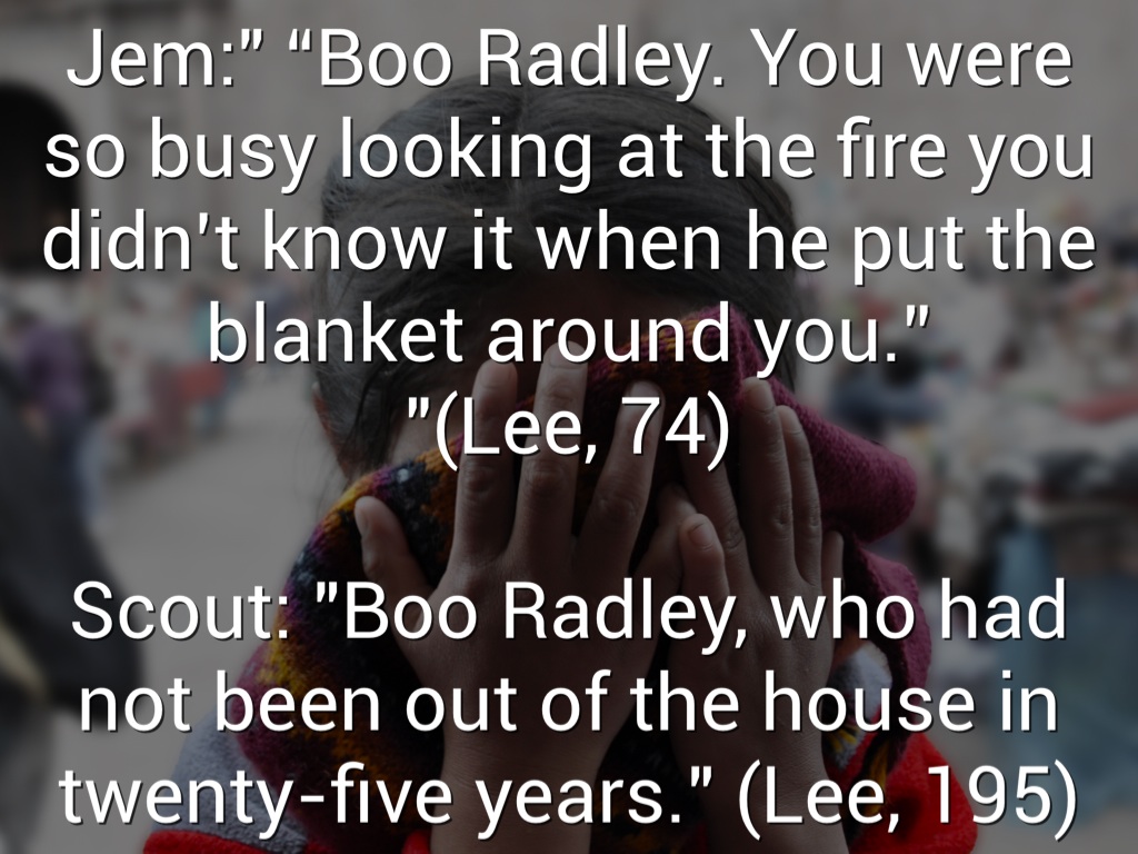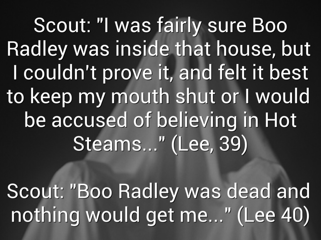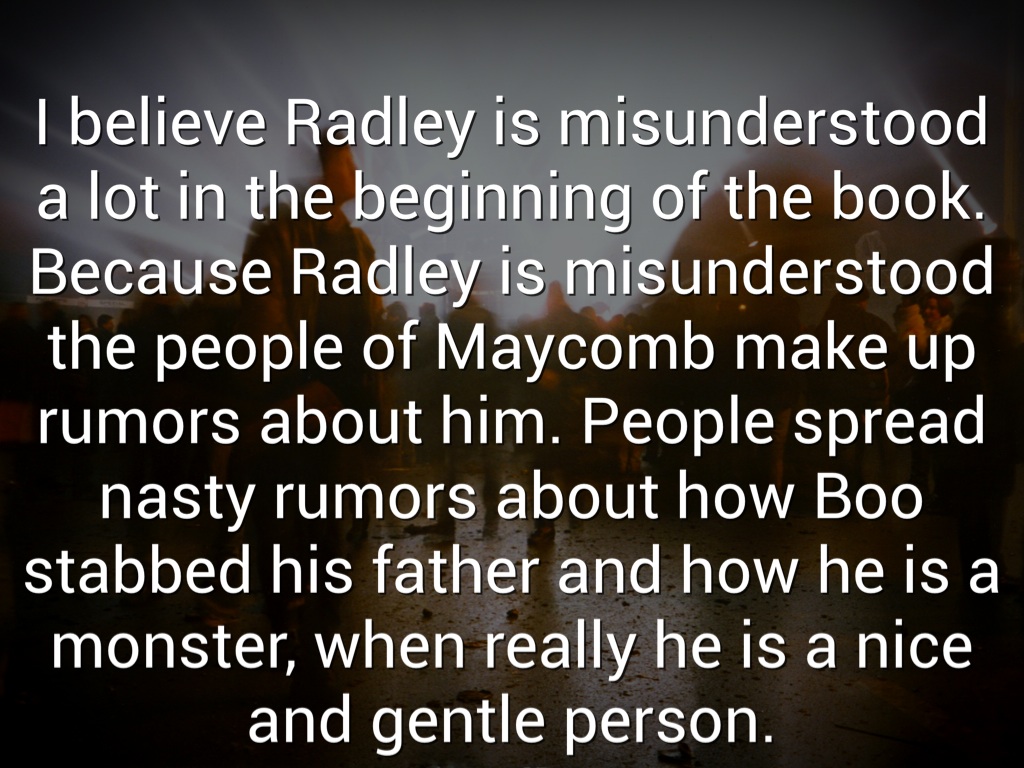 I believe that Boo Radley is a mysterious character like a ghost, due to him being portrayed as a mysterious and unknown character. I also believe that the author, Harper Lee, wanted to symbolize Radley as a ghost, hence his nickname "Boo" Radley. Radley is unknown just like ghosts, and most people who believe in ghost believe that ghost are scary or bad. In the book Radley is portrayed in the beginning as an evil and bad kid, but only through rumors. But later on in the story we see Radley is a gentle and kind person due to his good actions.