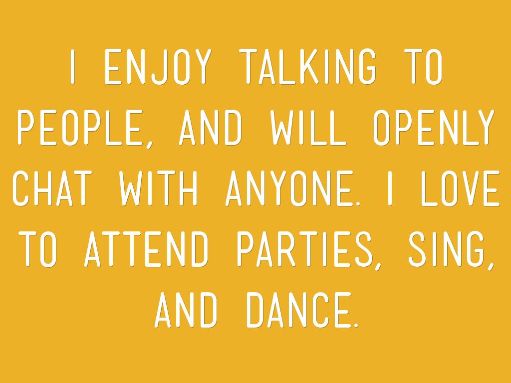 I enjoy talking to people, and will openly chat with anyone. I love to attend parties, sing, and dance.