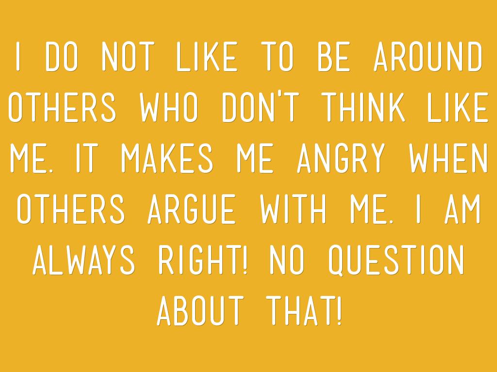 I do not like to be around others who don't think like me. It makes me angry when others argue with me. I am always right! No question about THAT!