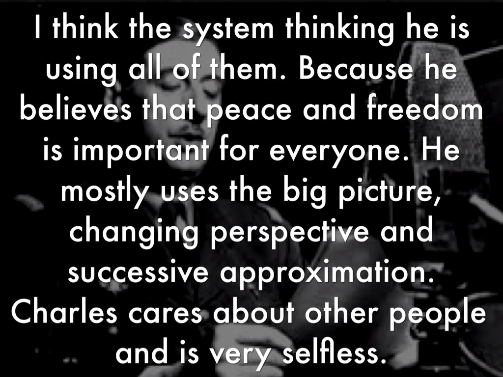 I think the system thinking he is using all of them. Because he believes that peace and freedom is important for everyone. He mostly uses the big picture, changing perspective and successive approximation. Charles cares about other people and is very selfless.