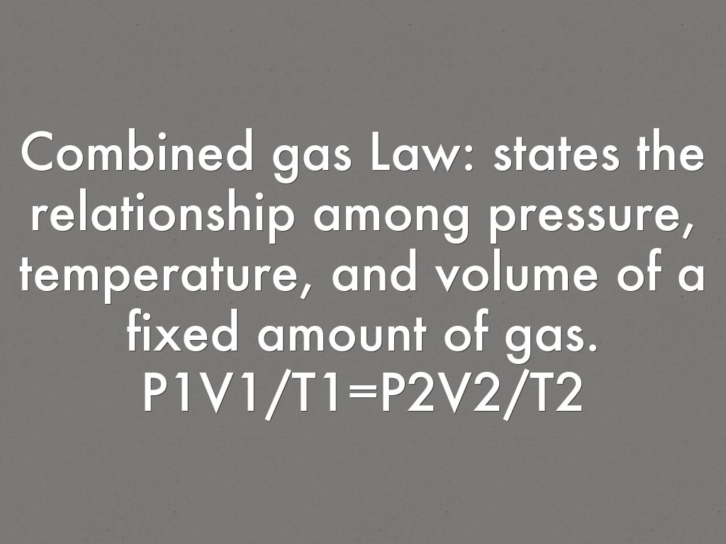 Combined gas Law: states the relationship among pressure, temperature, and volume of a fixed amount of gas.