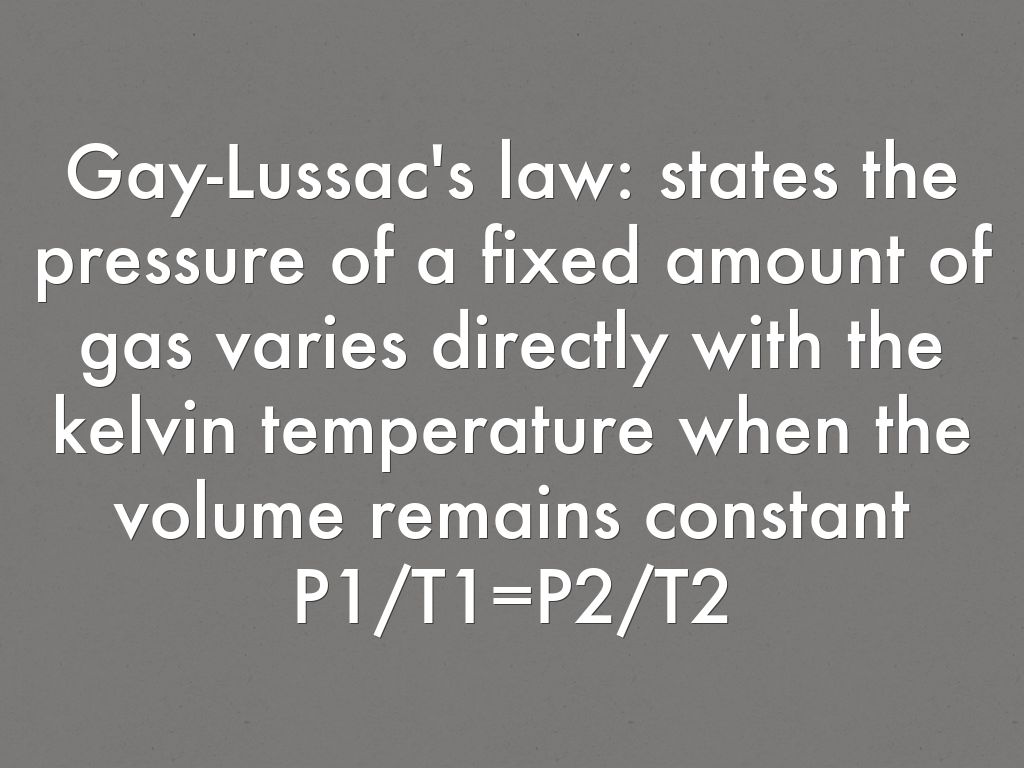 Gay-Lussac's law: states the pressure of a fixed amount of gas varies directly with the kelvin temperature when the volume remains constant
