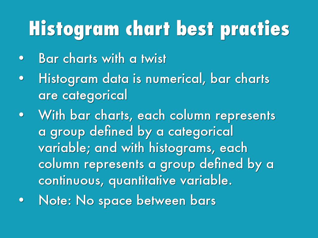 With bar charts, each column represents a group defined by a categorical variable; and with histograms, each column represents a group defined by a continuous, quantitative variable.