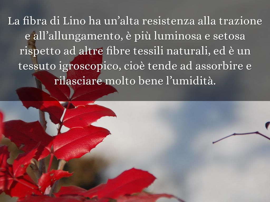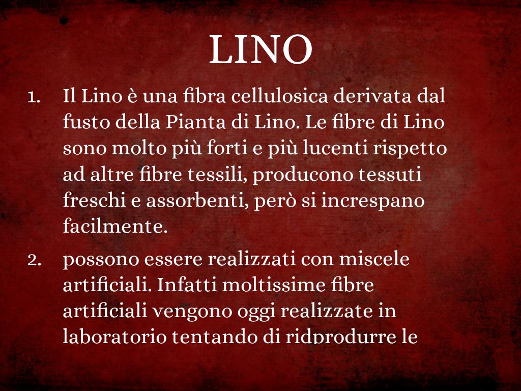• Il Lino è una fibra cellulosica derivata dal fusto della Pianta di Lino. Le fibre di Lino sono molto più forti e più lucenti rispetto ad altre fibre tessili, producono tessuti freschi e assorbenti, però si increspano facilmente.