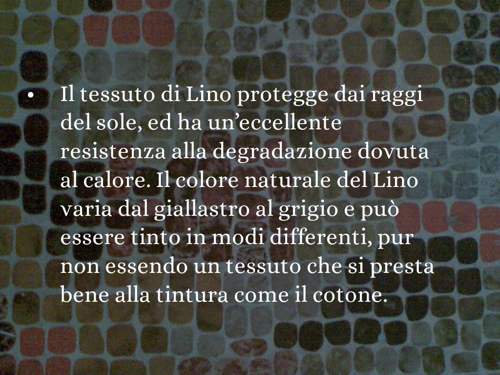 • Il tessuto di Lino protegge dai raggi del sole, ed ha un’eccellente resistenza alla degradazione dovuta al calore. Il colore naturale del Lino varia dal giallastro al grigio e può essere tinto in modi differenti, pur non essendo un tessuto che si presta bene alla tintura come il cotone.