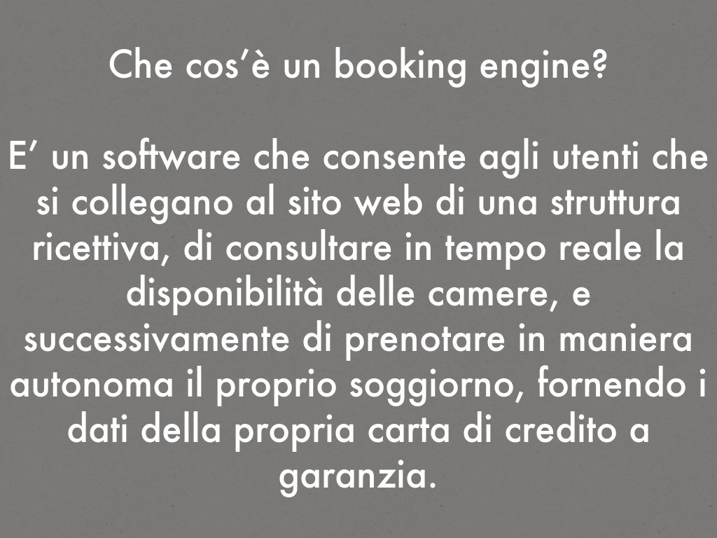 E’ un software che consente agli utenti che si collegano al sito web di una struttura ricettiva, di consultare in tempo reale la disponibilità delle camere, e successivamente di prenotare in maniera autonoma il proprio soggiorno, fornendo i dati della propria carta di credito a garanzia.