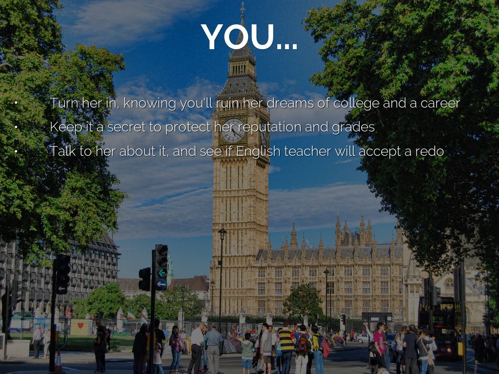 - Turn her in, knowing you'll ruin her dreams of college and a career