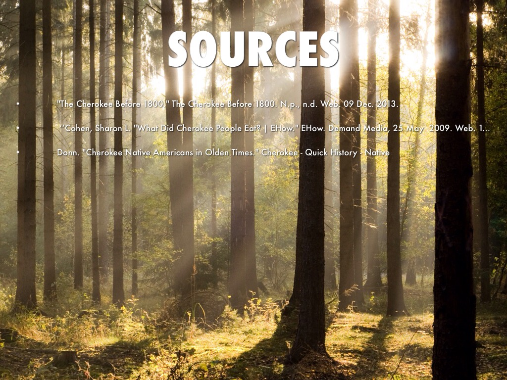 ‘’Cohen, Sharon L. "What Did Cherokee People Eat? | EHow." EHow. Demand Media, 25 May 2009. Web. 11 Dec. 2013.