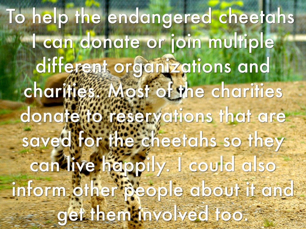 To help the endangered cheetahs I can donate or join multiple different organizations and charities. Most of the charities donate to reservations that are saved for the cheetahs so they can live happily. I could also inform other people about it and get them involved too.