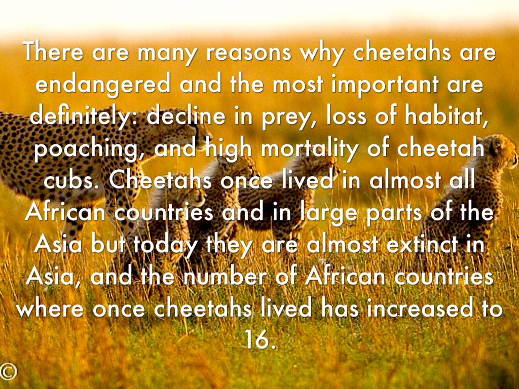 There are many reasons why cheetahs are endangered and the most important are definitely: decline in prey, loss of habitat, poaching, and high mortality of cheetah cubs. Cheetahs once lived in almost all African countries and in large parts of the Asia but today they are almost extinct in Asia, and the number of African countries where once cheetahs lived has increased to 16.