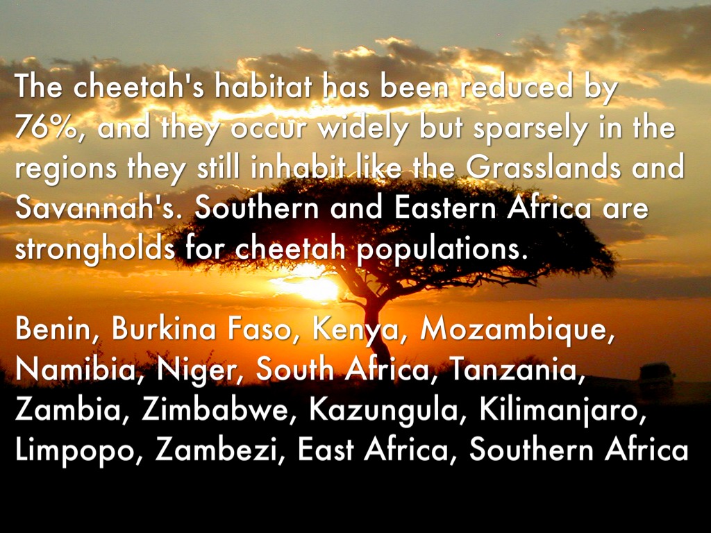 The cheetah's habitat has been reduced by 76%, and they occur widely but sparsely in the regions they still inhabit like the Grasslands and Savannah's. Southern and Eastern Africa are strongholds for cheetah populations.