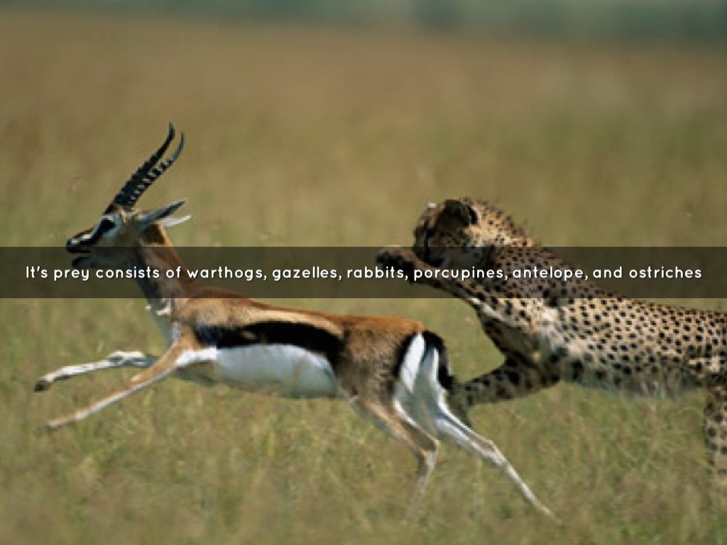 It's prey consists of warthogs, gazelles, rabbits, porcupines, antelope, and ostriches