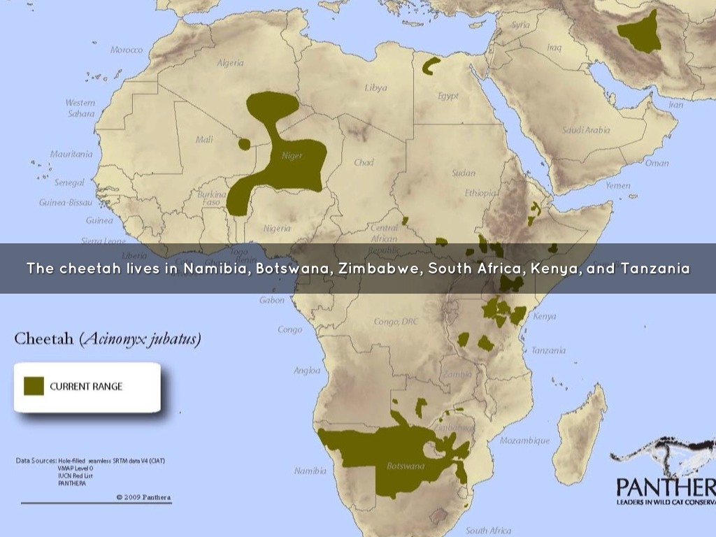 The cheetah lives in Namibia, Botswana, Zimbabwe, South Africa, Kenya, and Tanzania