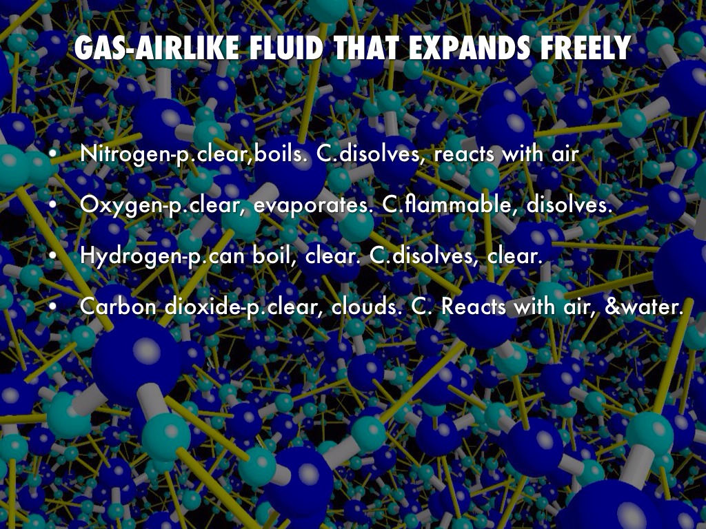 Carbon dioxide-p.clear, clouds. C. Reacts with air, &water.