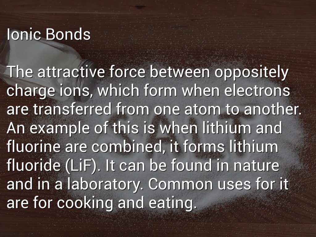 The attractive force between oppositely charge ions, which form when electrons are transferred from one atom to another. An example of this is when lithium and fluorine are combined, it forms lithium fluoride (LiF). It can be found in nature and in a laboratory. Common uses for it are for cooking and eating.