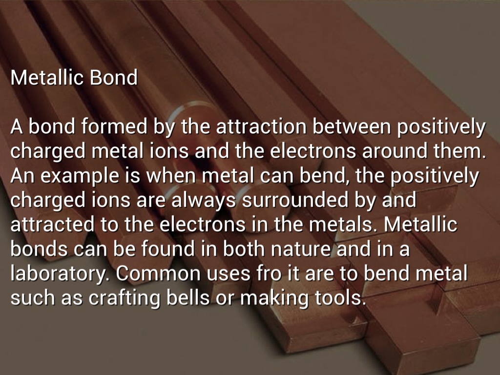 A bond formed by the attraction between positively charged metal ions and the electrons around them. An example is when metal can bend, the positively charged ions are always surrounded by and attracted to the electrons in the metals. Metallic bonds can be found in both nature and in a laboratory. Common uses fro it are to bend metal such as crafting bells or making tools.