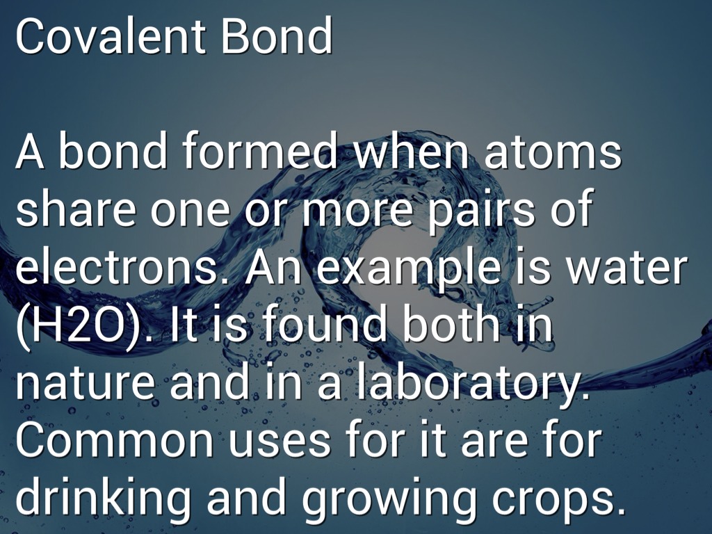 A bond formed when atoms share one or more pairs of electrons. An example is water (H2O). It is found both in nature and in a laboratory. Common uses for it are for drinking and growing crops.