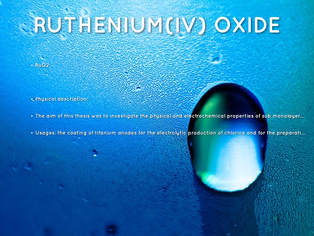 Usages: the coating of titanium anodes for the electrolytic production of chlorine and for the preparation of resistors or integrated circuits.