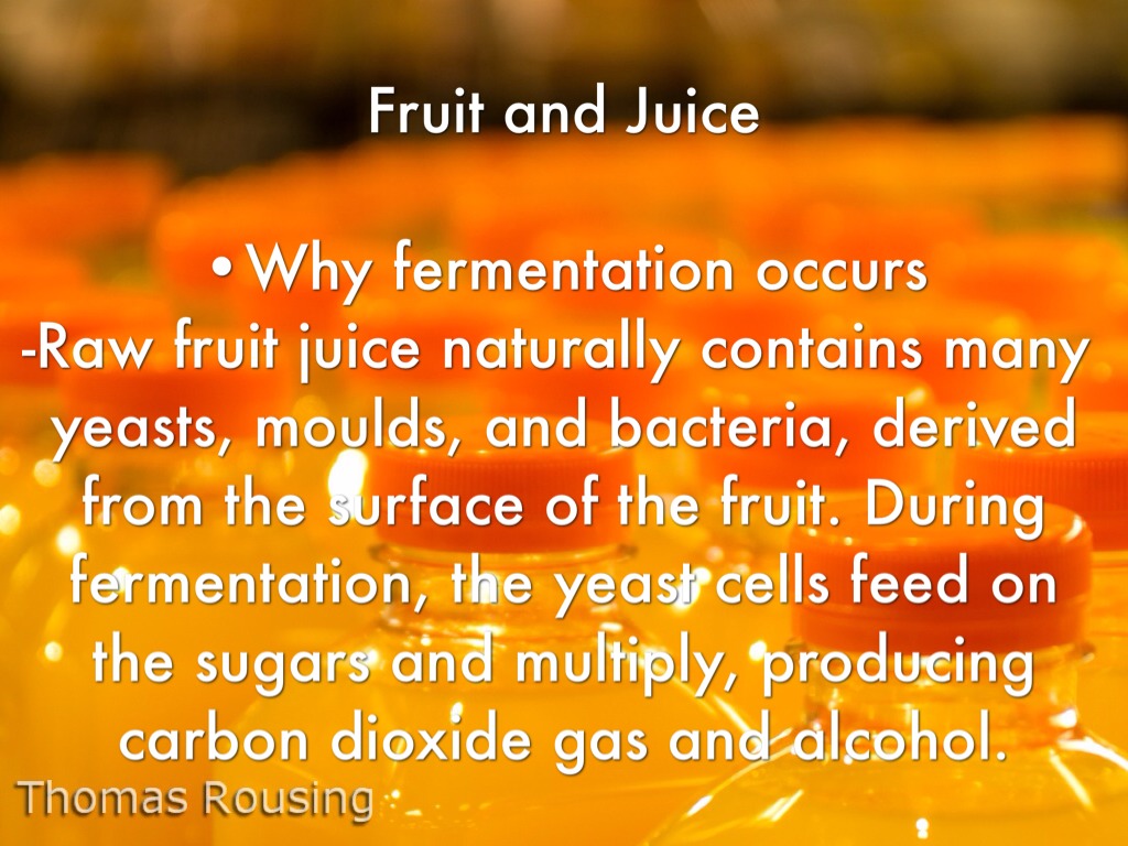 -Raw fruit juice naturally contains many yeasts, moulds, and bacteria, derived from the surface of the fruit. During fermentation, the yeast cells feed on the sugars and multiply, producing carbon dioxide gas and alcohol.
