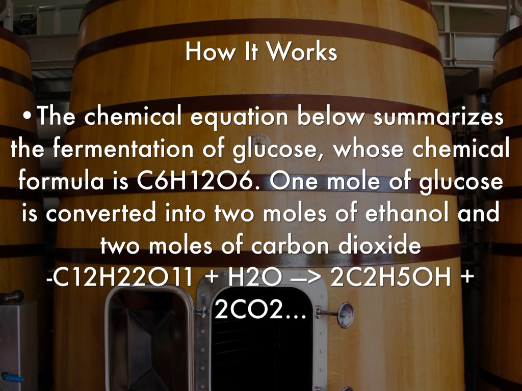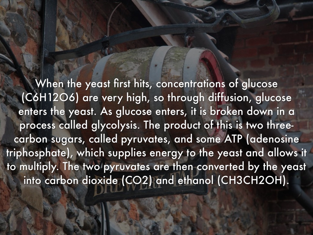 When the yeast first hits, concentrations of glucose (C6H12O6) are very high, so through diffusion, glucose enters the yeast. As glucose enters, it is broken down in a process called glycolysis. The product of this is two three-carbon sugars, called pyruvates, and some ATP (adenosine triphosphate), which supplies energy to the yeast and allows it to multiply. The two pyruvates are then converted by the yeast into carbon dioxide (CO2) and ethanol (CH3CH2OH).