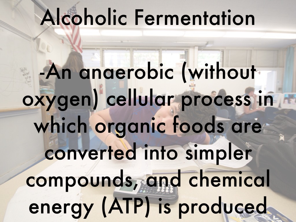 -An anaerobic (without oxygen) cellular process in which organic foods are converted into simpler compounds, and chemical energy (ATP) is produced