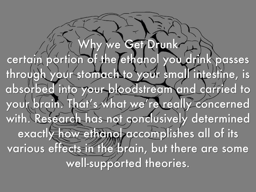 certain portion of the ethanol you drink passes through your stomach to your small intestine, is absorbed into your bloodstream and carried to your brain. That’s what we’re really concerned with. Research has not conclusively determined exactly how ethanol accomplishes all of its various effects in the brain, but there are some well-supported theories.