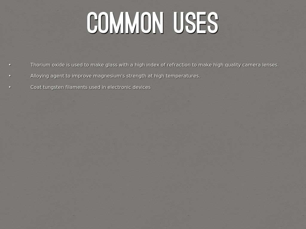 Thorium oxide is used to make glass with a high index of refraction to make high quality camera lenses.