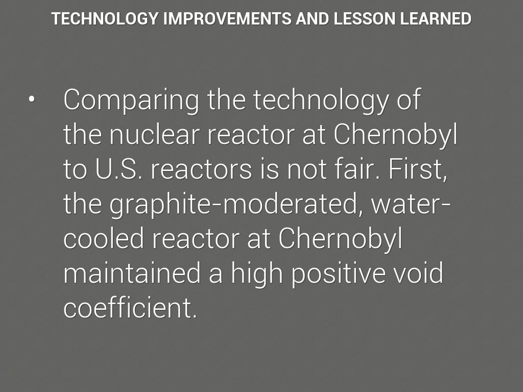 Comparing the technology of the nuclear reactor at Chernobyl to U.S. reactors is not fair. First, the graphite-moderated, water-cooled reactor at Chernobyl maintained a high positive void coefficient.