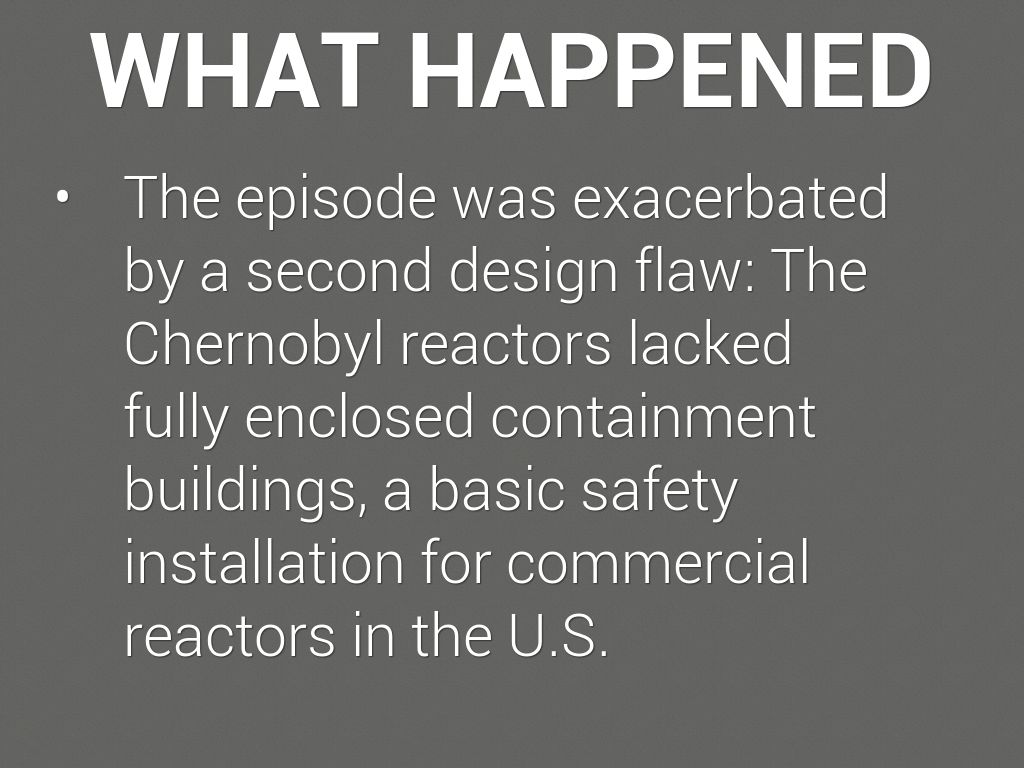 The episode was exacerbated by a second design flaw: The Chernobyl reactors lacked fully enclosed containment buildings, a basic safety installation for commercial reactors in the U.S.