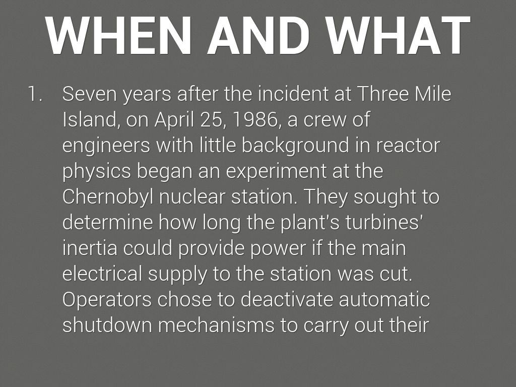 Seven years after the incident at Three Mile Island, on April 25, 1986, a crew of engineers with little background in reactor physics began an experiment at the Chernobyl nuclear station. They sought to determine how long the plant's turbines' inertia could provide power if the main electrical supply to the station was cut. Operators chose to deactivate automatic shutdown mechanisms to carry out their experiment