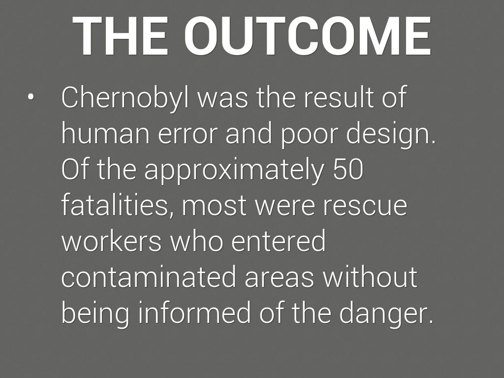 Chernobyl was the result of human error and poor design. Of the approximately 50 fatalities, most were rescue workers who entered contaminated areas without being informed of the danger.