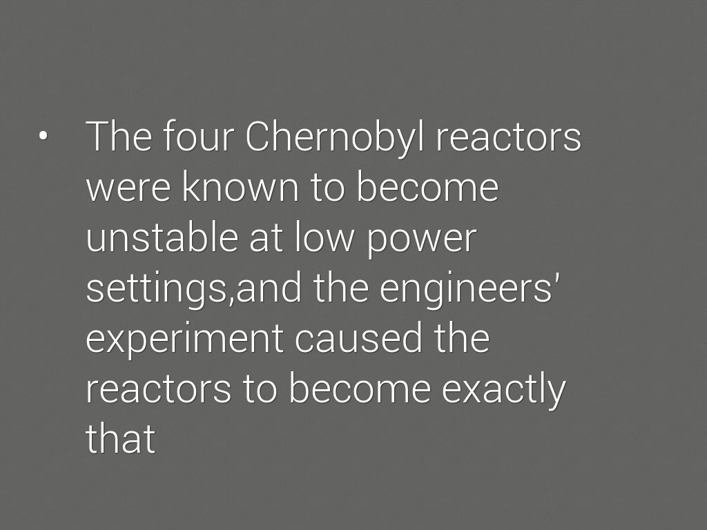 The four Chernobyl reactors were known to become unstable at low power settings,and the engineers' experiment caused the reactors to become exactly that