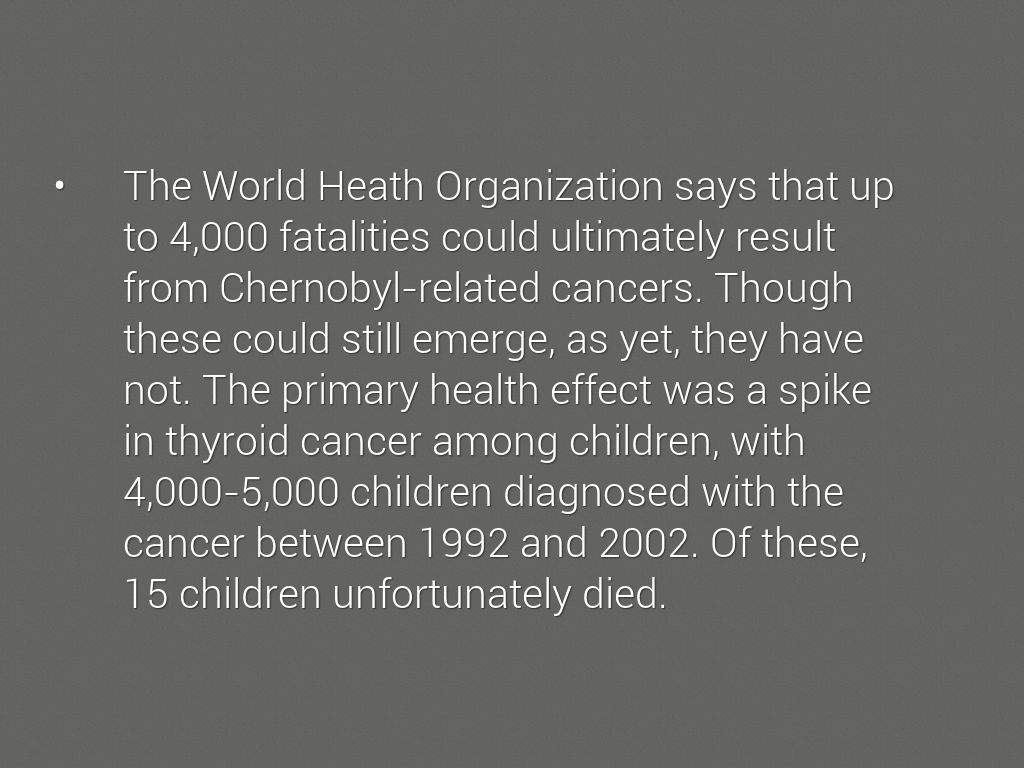 The World Heath Organization says that up to 4,000 fatalities could ultimately result from Chernobyl-related cancers. Though these could still emerge, as yet, they have not. The primary health effect was a spike in thyroid cancer among children, with 4,000-5,000 children diagnosed with the cancer between 1992 and 2002. Of these, 15 children unfortunately died.