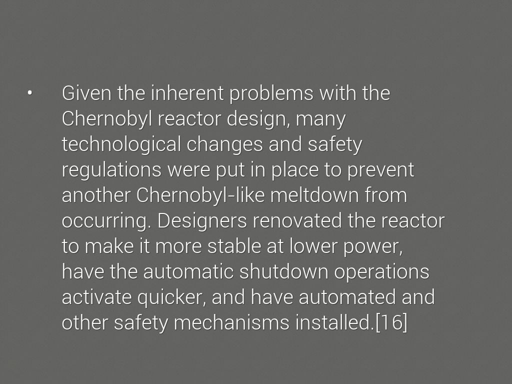 Given the inherent problems with the Chernobyl reactor design, many technological changes and safety regulations were put in place to prevent another Chernobyl-like meltdown from occurring. Designers renovated the reactor to make it more stable at lower power, have the automatic shutdown operations activate quicker, and have automated and other safety mechanisms installed.[16]