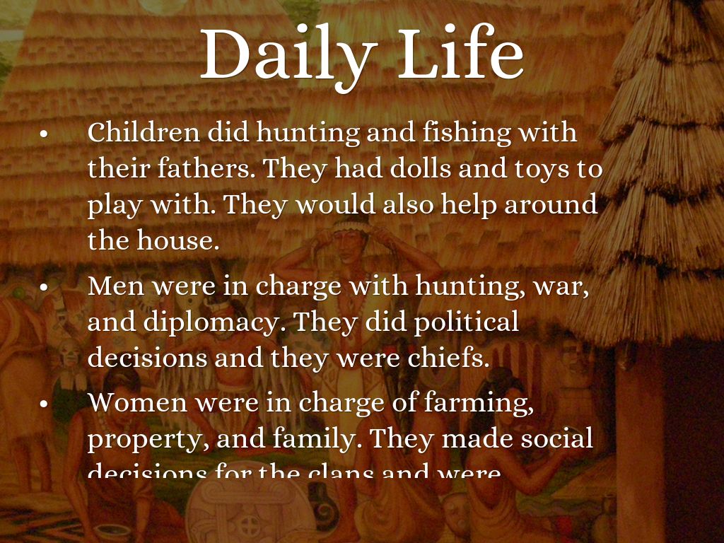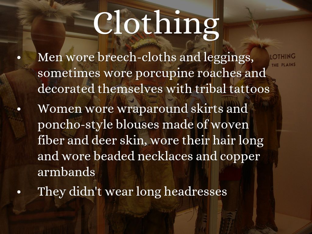 Men wore breech-cloths and leggings, sometimes wore porcupine roaches and decorated themselves with tribal tattoos