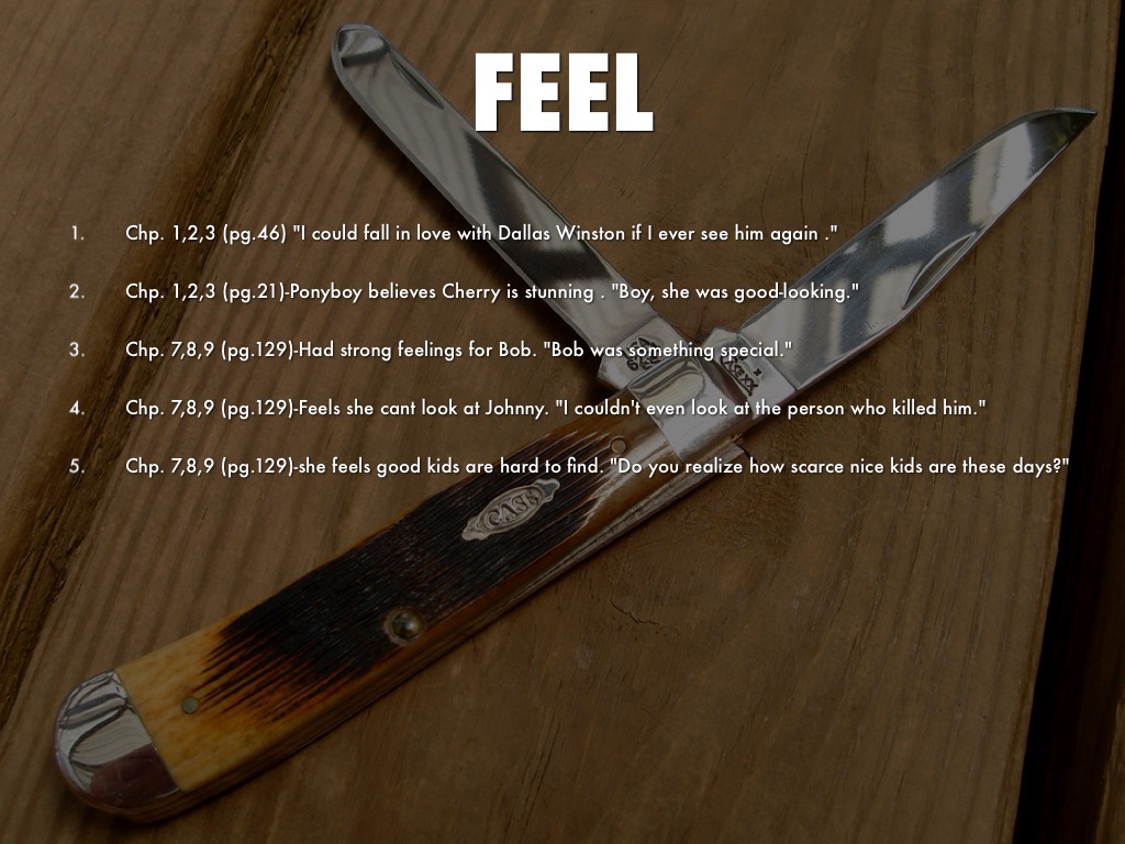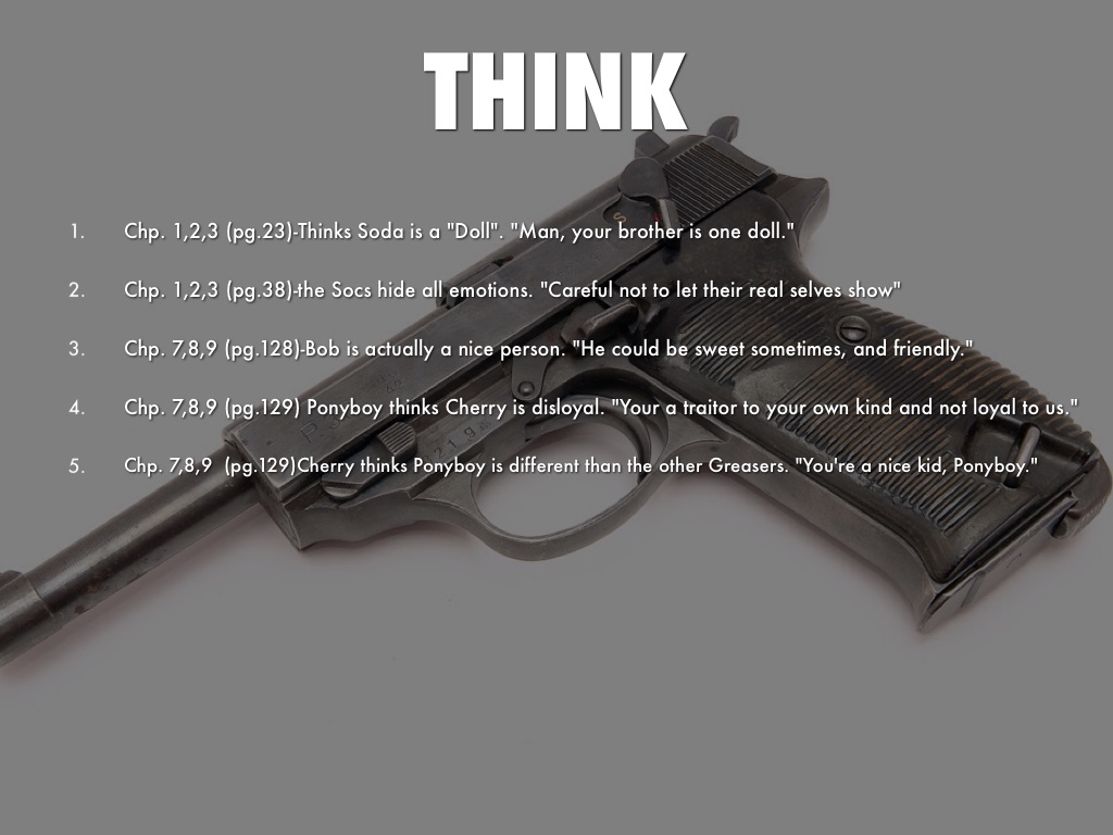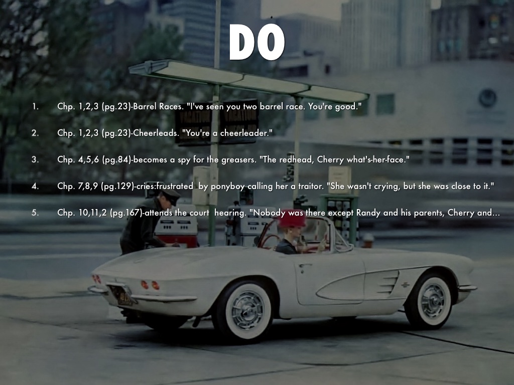 Chp. 7,8,9 (pg.129)Cherry thinks Ponyboy is different than the other Greasers. "You're a nice kid, Ponyboy."