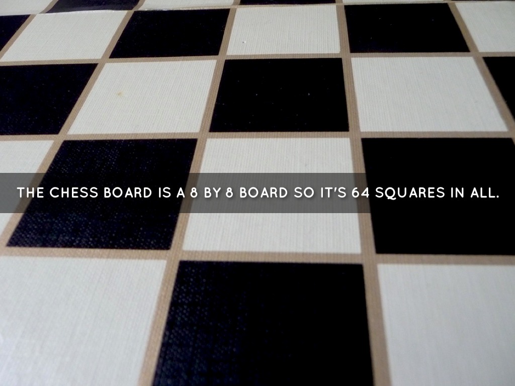 THE CHESS BOARD IS A 8 BY 8 BOARD SO IT'S 64 SQUARES IN ALL.