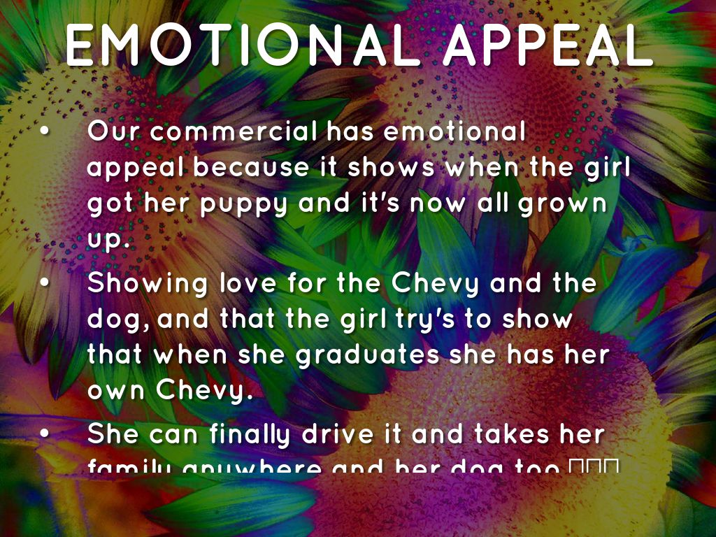 Our commercial has emotional appeal because it shows when the girl got her puppy and it's now all grown up.