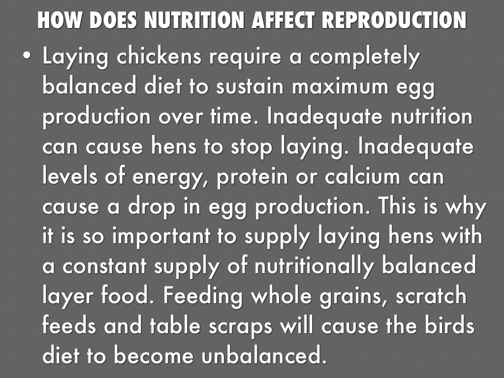 Laying chickens require a completely balanced diet to sustain maximum egg production over time. Inadequate nutrition can cause hens to stop laying. Inadequate levels of energy, protein or calcium can cause a drop in egg production. This is why it is so important to supply laying hens with a constant supply of nutritionally balanced layer food. Feeding whole grains, scratch feeds and table scraps will cause the birds diet to become unbalanced.