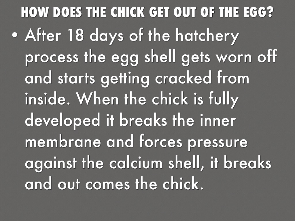 After 18 days of the hatchery process the egg shell gets worn off and starts getting cracked from inside. When the chick is fully developed it breaks the inner membrane and forces pressure against the calcium shell, it breaks and out comes the chick.