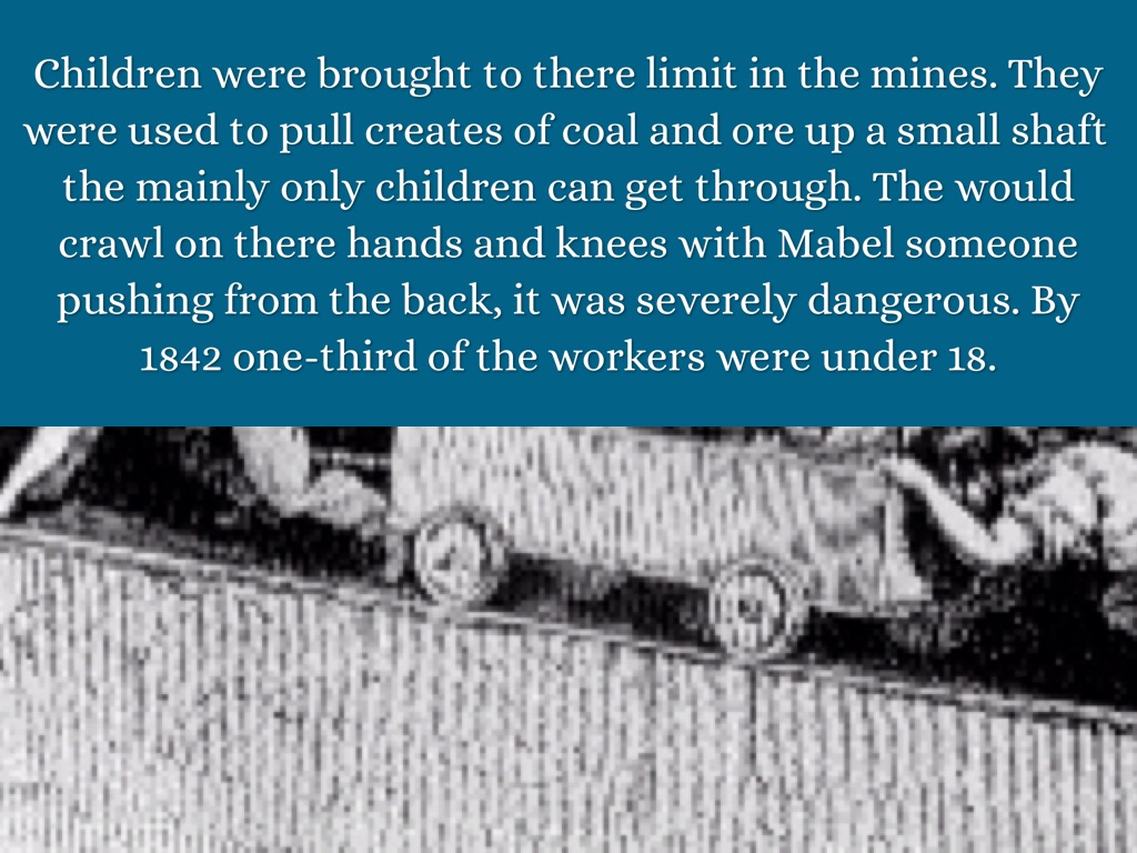 Children were brought to there limit in the mines. They were used to pull creates of coal and ore up a small shaft the mainly only children can get through. The would crawl on there hands and knees with Mabel someone pushing from the back, it was severely dangerous. By 1842 one-third of the workers were under 18.