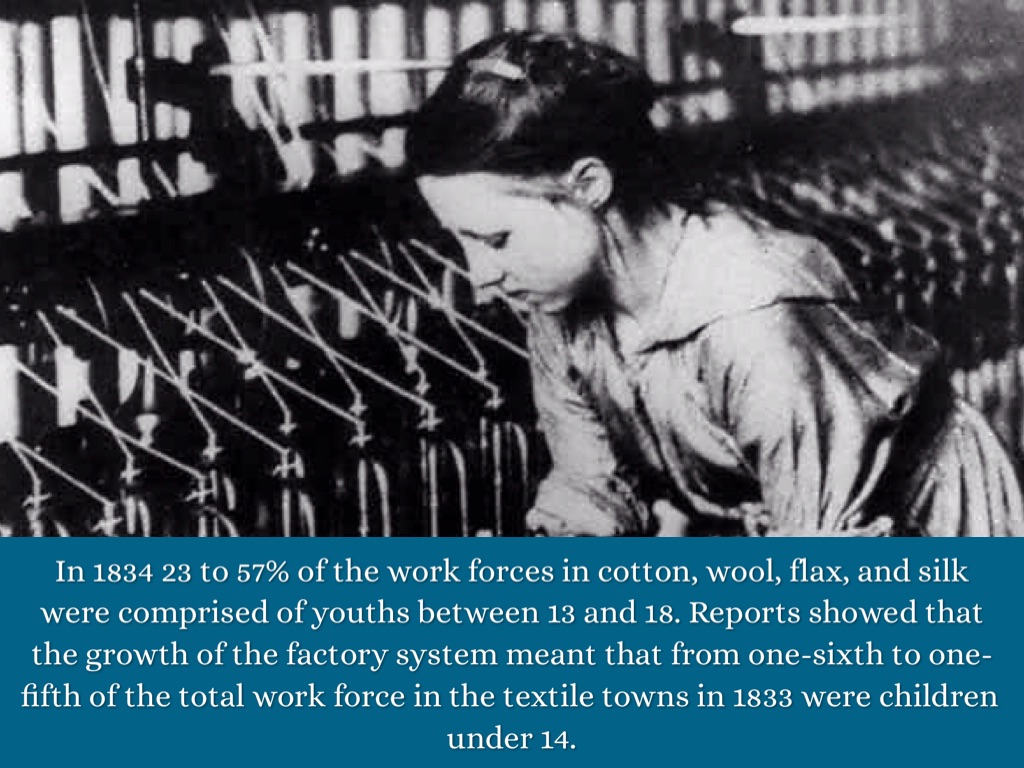 In 1834 23 to 57% of the work forces in cotton, wool, flax, and silk were comprised of youths between 13 and 18. Reports showed that the growth of the factory system meant that from one-sixth to one-fifth of the total work force in the textile towns in 1833 were children under 14.