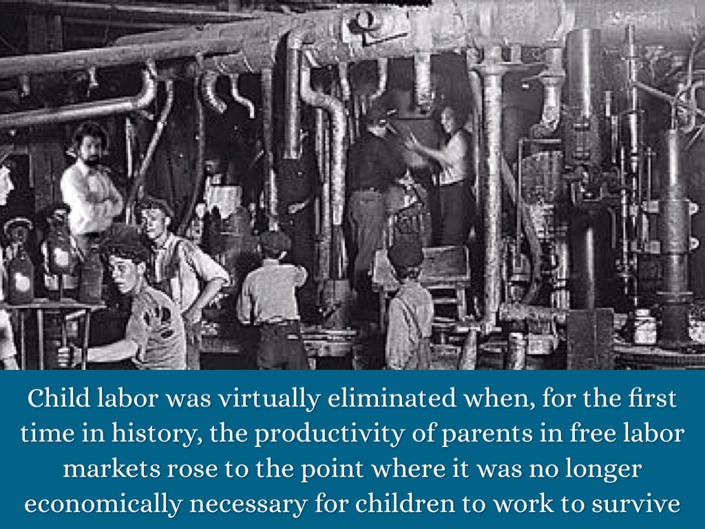 Child labor was virtually eliminated when, for the first time in history, the productivity of parents in free labor markets rose to the point where it was no longer economically necessary for children to work to survive