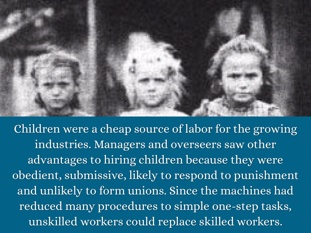 Children were a cheap source of labor for the growing industries. Managers and overseers saw other advantages to hiring children because they were obedient, submissive, likely to respond to punishment and unlikely to form unions. Since the machines had reduced many procedures to simple one-step tasks, unskilled workers could replace skilled workers.